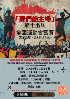 全國運動會是國家最高水平、最大規模的綜合性運動會。今年,香港將歷史性地首次成為協辦城市,讓我們能親身感受頂級體育盛事的熾熱氣氛,並見證國家運動員的拼搏精神。為方便同學參與,學校將安排旅遊巴接送觀賽學生往返學校和活動場地。